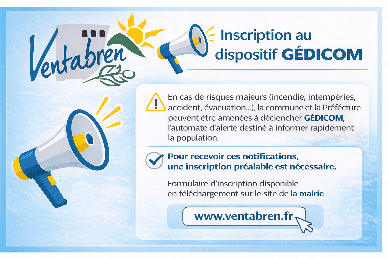 En cas de risques majeurs (incendie, intempéries, évacuation...), la commune et la Préfecture peuvent être amenées à déclencher GEDICOM, l'automate d'alerte destiné à informer rapidement la population.