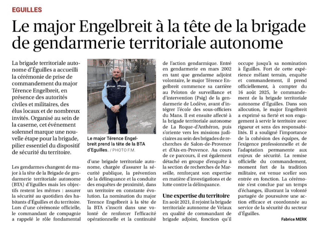 Le major Engelbreit à la tête de la brigade de gendarmerie territoriale d’Éguilles
