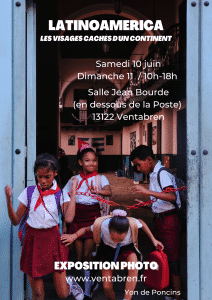- Samedi 10 et Dimanche 11 Juin – Salle Jean Bourde : Cette exposition gratuite est l’échantillon d’un an de voyage au plus près du peuple latino-américain. Des communautés indigènes aux habitants de favelas, le photographe Yon de PONCINS a vu des scènes captivantes qu’il souhaite aujourd’hui partager en images. Une occasion de se réunir autour du voyage !