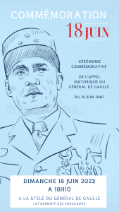 - Dimanche 18 Juin, à 18h10 aura lieu la commémoration de l’appel du Général de Gaulle, à la Stèle de l’Avenue Charles de Gaulle.