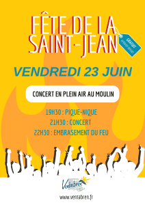 - Vendredi 23 Juin – Vieux Moulin à Vent : Concert gratuit animé par le groupe « Millenium », avec le traditionnel pique-nique sur place avant l’embrasement du feu.