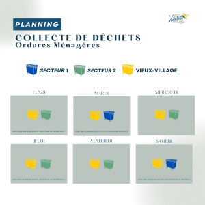 3. Respecter les jours de collecte et garder ses encombrants pour le service dédié ! : Vous trouverez ci-dessous le planning de collecte des différents types de déchets, selon les différents points. Pour vos encombrants, ne surchargez pas les bacs jaunes, contactez le services des encombrants qui viendra les ramasser directement chez vous (numéro du service des encombrants ci-dessous – sur rdv tous les premiers mardis de chaque mois).