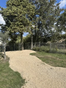 Un cheminement piéton est en cours d’aménagement pour rejoindre le mail de l’Héritière, la crèche et l’école Jean d’Ormesson ainsi que le parking du haut de l’Héritière. À noter que les piétons ne seront pas autorisés pour des raisons évidentes de sécurité à emprunter la sortie sur la RD10.