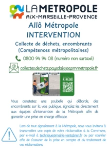 - Pour vos encombrants ou toute autre question liée aux déchets, contacter les services du Pôle déchets du Pays D’Aix au 0800 94 94 08 (numéro non surtaxé).