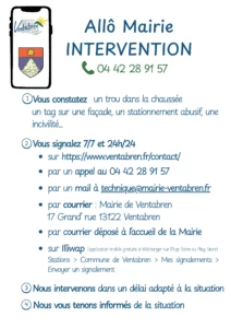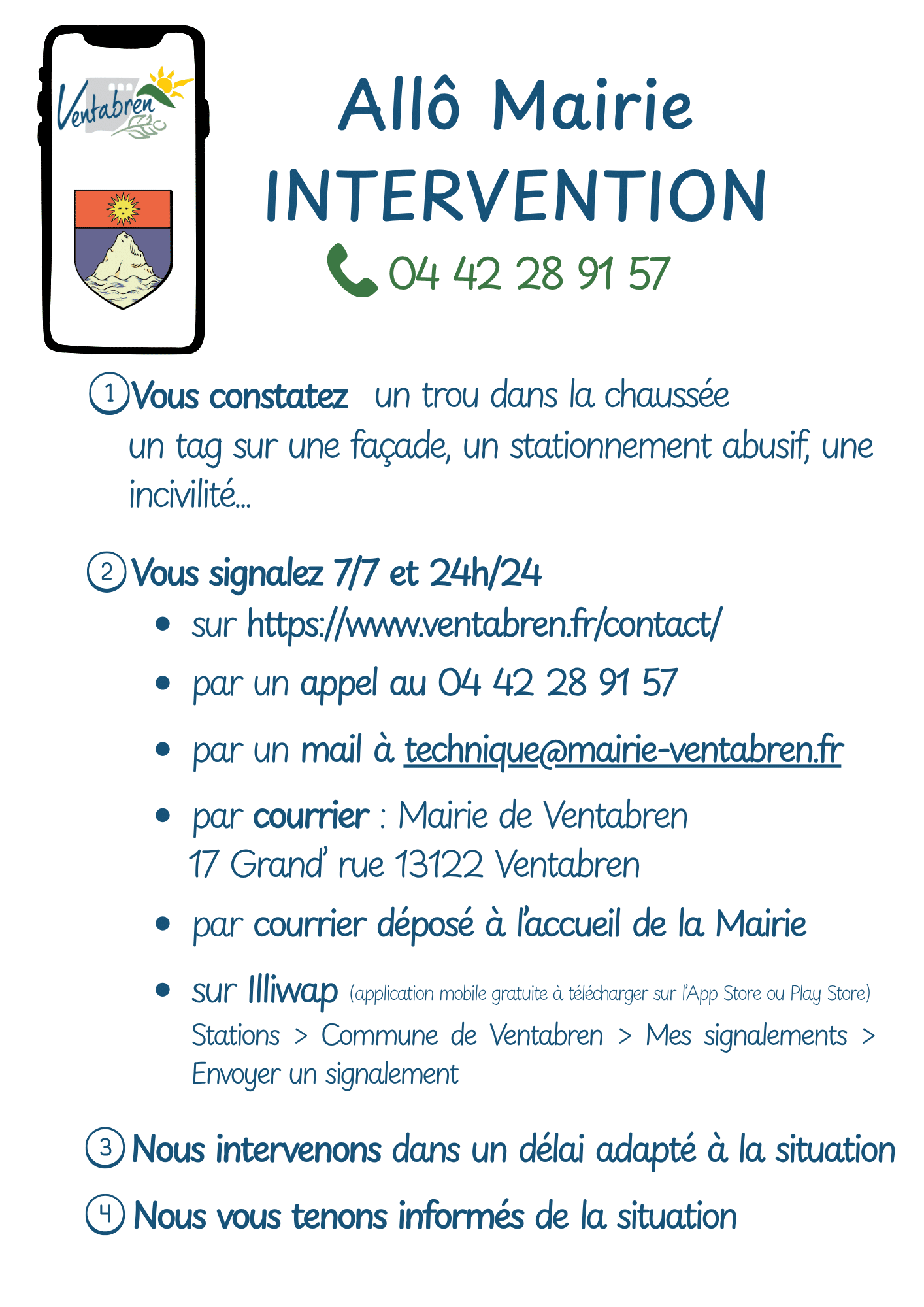 - Pour tout ce qui concerne, les problèmes de voirie, les anomalies sur les réseaux filaires publics, contacter les services techniques par mail (technique@mairie-ventabren.fr).